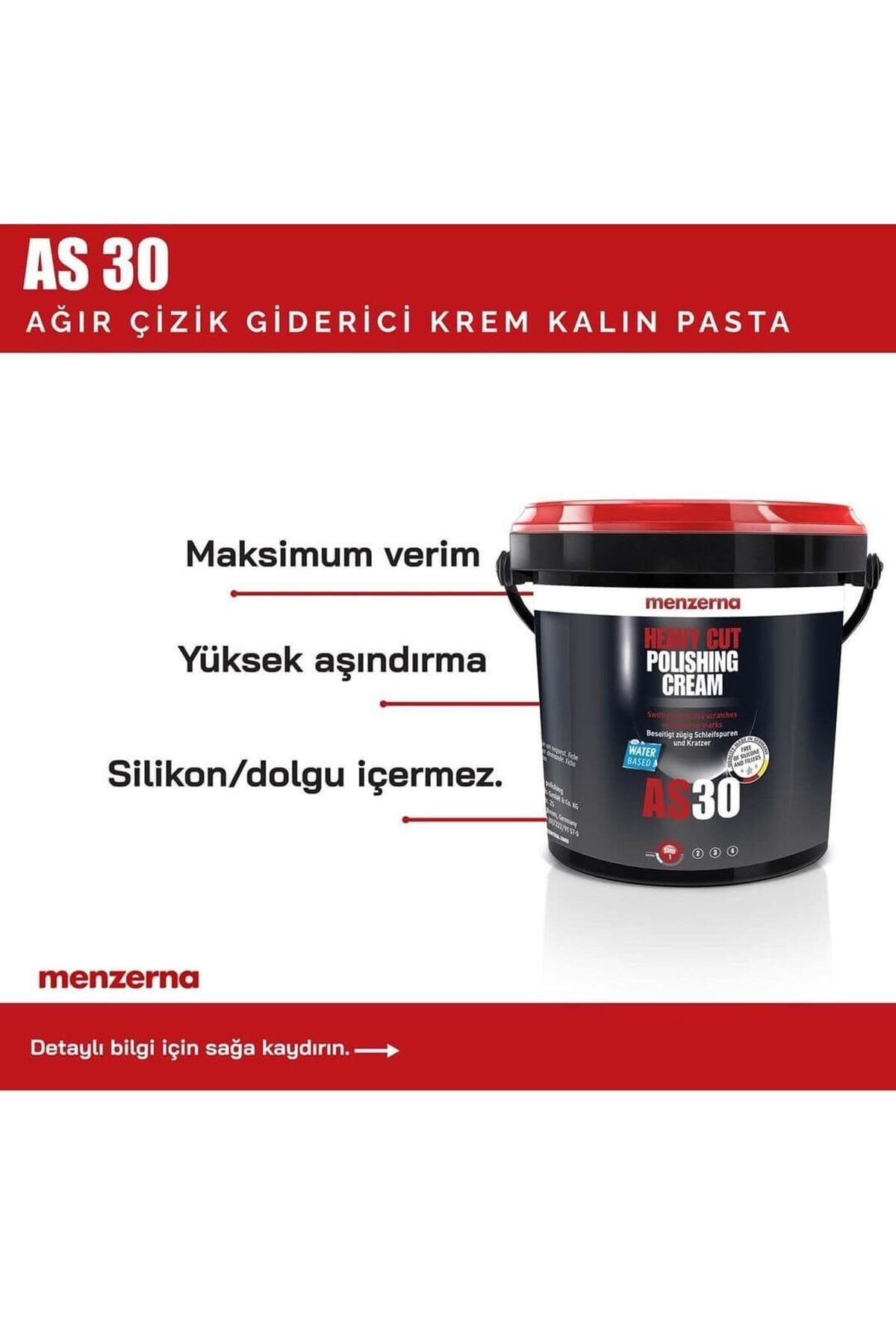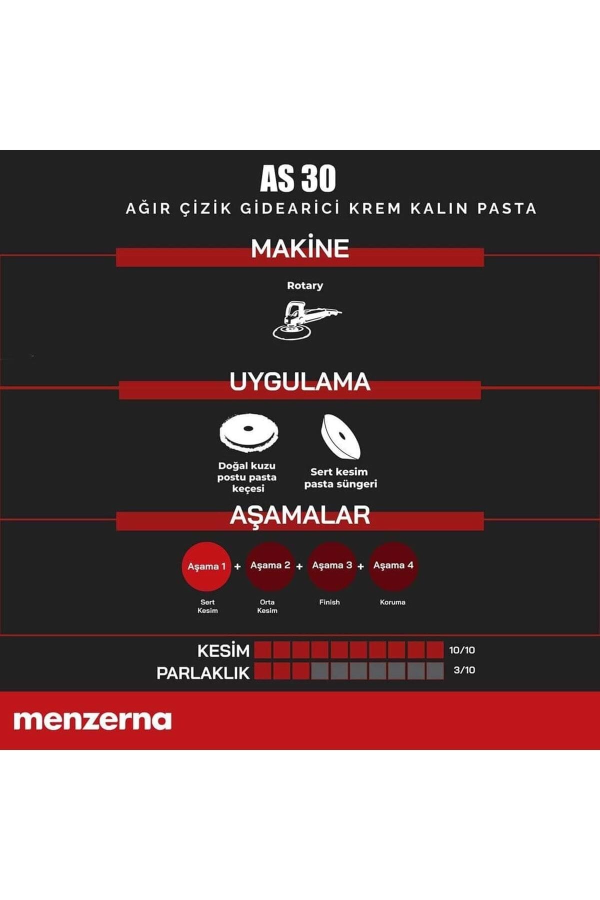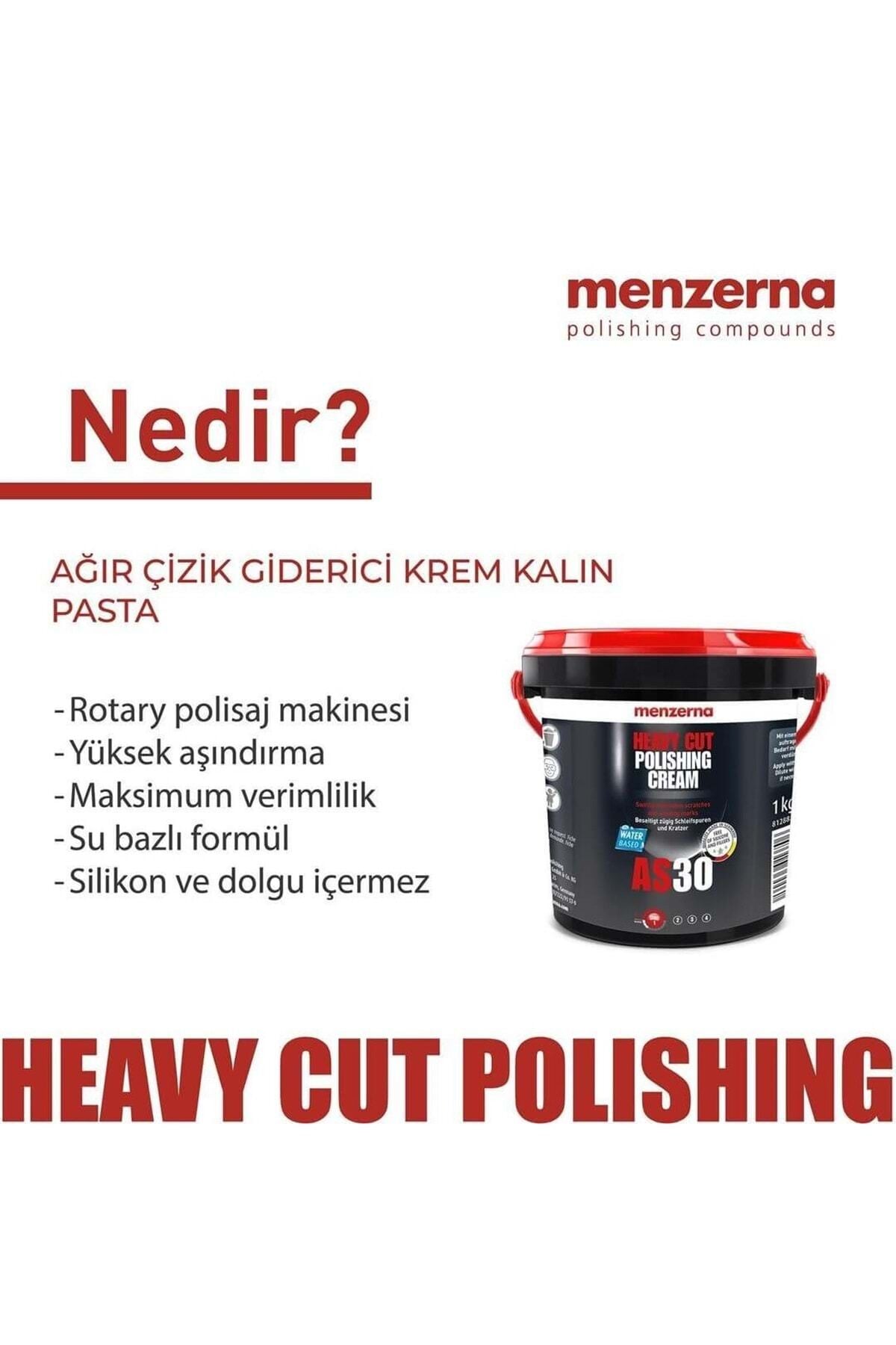 Otomotiv sektöründe araç bakım ve onarım ürünlerinin kalitesi, o aracın sunacağı estetik ve dayanıklılığa doğrudan etki eder.; Pasta cila malzemeleri, bu süreçte kilit bir role sahiptir.; Özellikle pasta cila ile çizik giderme, aracın yüzeyinin mükemmel görünmesini sağlar.; Bu bağlamda, Menzerna AS 30, sektördeki en iyi pasta cila ürünlerinden biri olarak dikkat çeker.; Profesyonel Çözüm: Etkili ve Güvenli Menzerna AS 30, boya ve zımpara hatalarını anında gideren bir kremdir.; Bu potansiyel sektör lideri, boya fazlalığı, izleri ve 800 kum zımpara seviyesi ve üstündeki çizikleri etkin bir şekilde temizleme kapasitesine sahip.; Su bazlı, silikonsuz formülü sayesinde, aracınıza zarar vermeden maksimum verim ile temizlik sunar.; Öne Çıkan Avantajları: • Çok Amaçlı Kullanım: Yeni boyanmış parçaların yanı sıra jelkotlarda da güvenle kullanabilirsiniz.; • Etkili Temizlik: Boya hataları ve inatçı zımpara izlerini kolayca giderir.; • Yüksek Aşındırma: Etkili ve derinlemesine temizlik sağlar.; • Ekonomik ve Verimli: Su bazlı formülü sayesinde ekonomik ve etkili bir kullanım sunar.; • Güvenli Formül: İçeriğinde silikon veya dolgu maddesi bulunmaz.; Teknik Detaylar: • Hacim: 1 kg.; • Kesme / Parlaklık Oranı: Mükemmel bir kesme oranı (10) ve parlaklık (3).; Uygulama Adımları: • Heavy Cut: Yoğun çizik ve izleri giderme aşaması.; Tavsiye Edilen Uygulama Araçları: • Kuzu Postu Keçe: Yoğun aşındırma için mükemmeldir.; • Sert Sünger Ped: Derinlemesine temizlik ve parlaklık için idealdir.; • Uygulama Tipi: Rotary makinelerle tam uyumludur.; Oto pasta cila deneyiminizi bir üst seviyeye taşımak ve Menzerna AS 30'un sunduğu profesyonel çözümleri deneyimlemek şimdi kullanın.