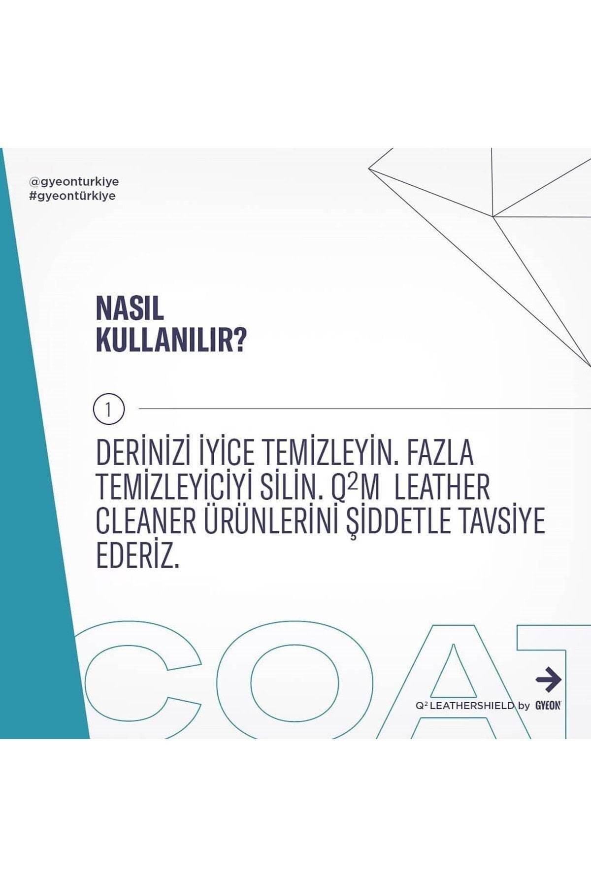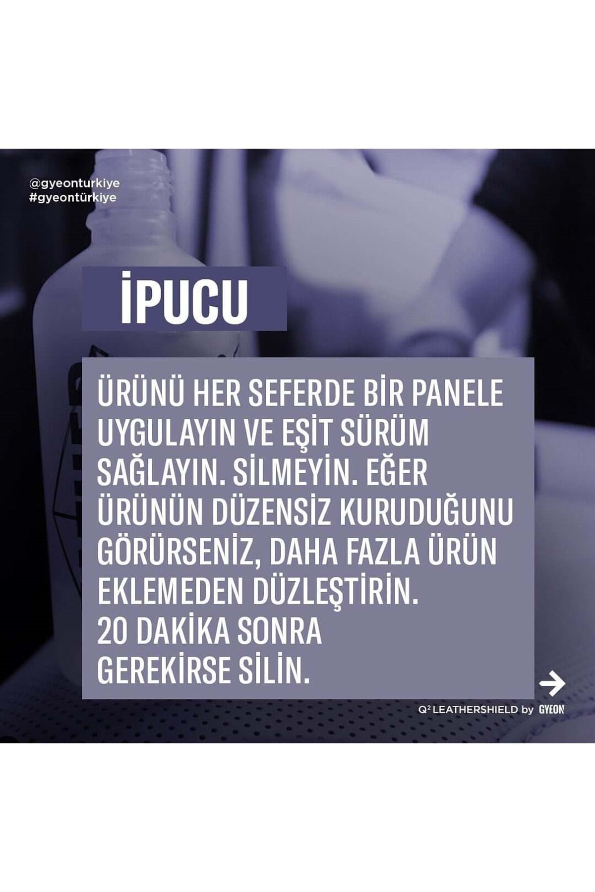 Deri aksamlar, aracınızın en hızlı kirlenen ve deforme olan parçalarıdır. ; Bu bölgelerin düzenli olarak temizlenmesi ve bakımı çoğu zaman zorlayıcı olabilir. ; GYEON, deri aksamlarınızın korunması ve bakımı için harika ürünler sunar! GYEON Q² LeatherShield, araçların deri döşemeleri için özel olarak geliştirilmiş seramik kaplamadır. ; Tüm deri döşemelerine uygun olan bu ürün, döşemelerinizin rengini veya yapısını değiştirmez. ; Kolay uygulama sağlar ve tek bir kat uygulamanız yeterlidir. ; Kirlenmeyi ve renk atmasını önlerken aynı zamanda UV ışınlarından da korur. ; KUTU İÇERİĞİ: • 50 ml LeatherShield Seramik Kaplama • Aplikatör • Süet Bez x4 • Kullanım Klavuzu NASIL KULLANILIR? • Deriyi temizleyin ve kurulayın. ; GYEON LeatherCleaner serisinden birini kullanmanız tavsiye edilir. ; • Ürünü tüm döşemeye uygulamadan önce bir test paneli üzerinde deneyin. ; • Ürünü tek bir panele eşit şekilde uygulayın ve silmeyin. ; Ürünün düzgün şekilde kuruduğundan emin olmak için tüy bırakmayan bir mikrofiber bez ile üzerinden geçebilirsiniz. ; • Gerekirse 20 dakika sonra kontrol edin ve silin. ; Dikkat! Profesyoneller tarafından uygulanması önerilir.;