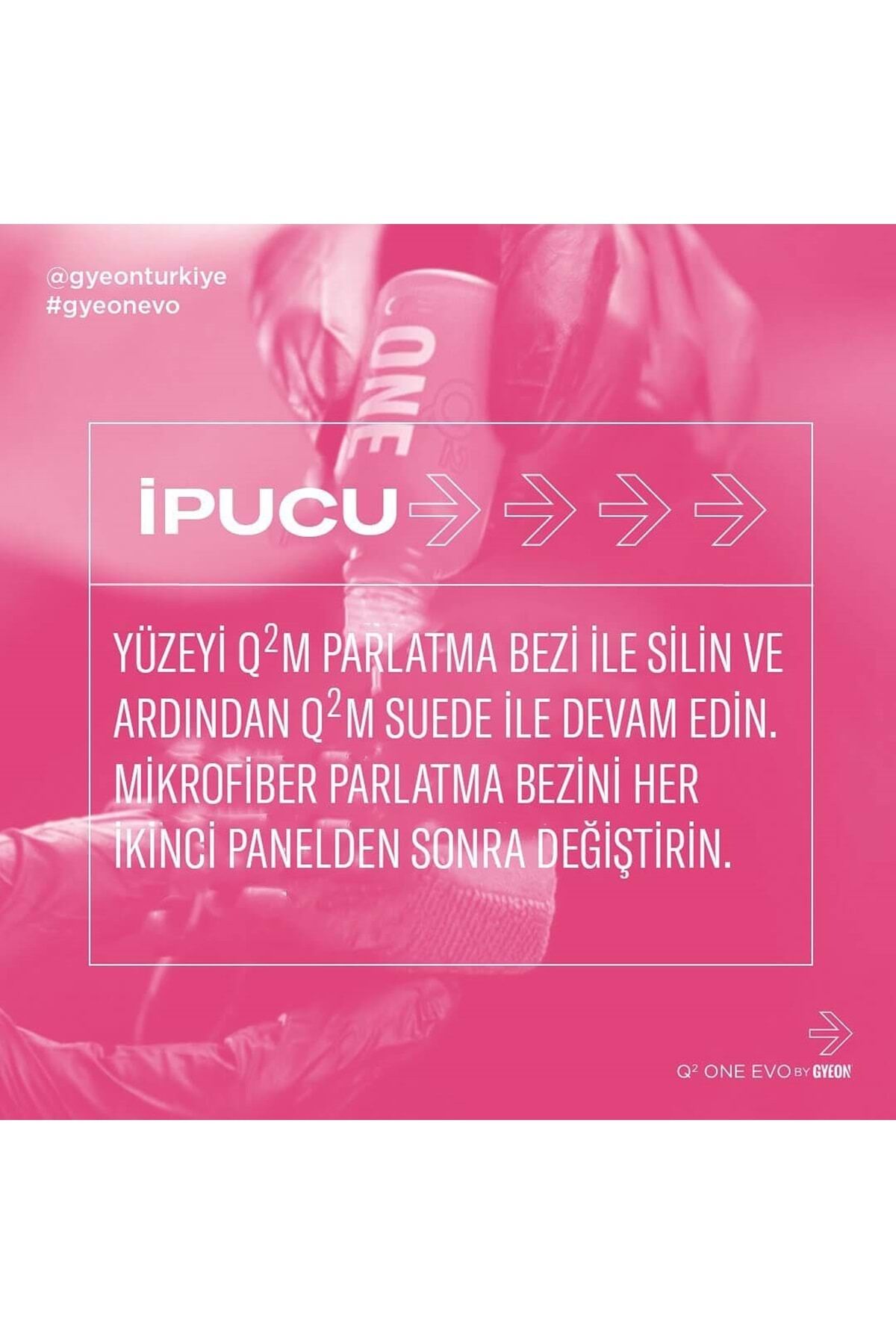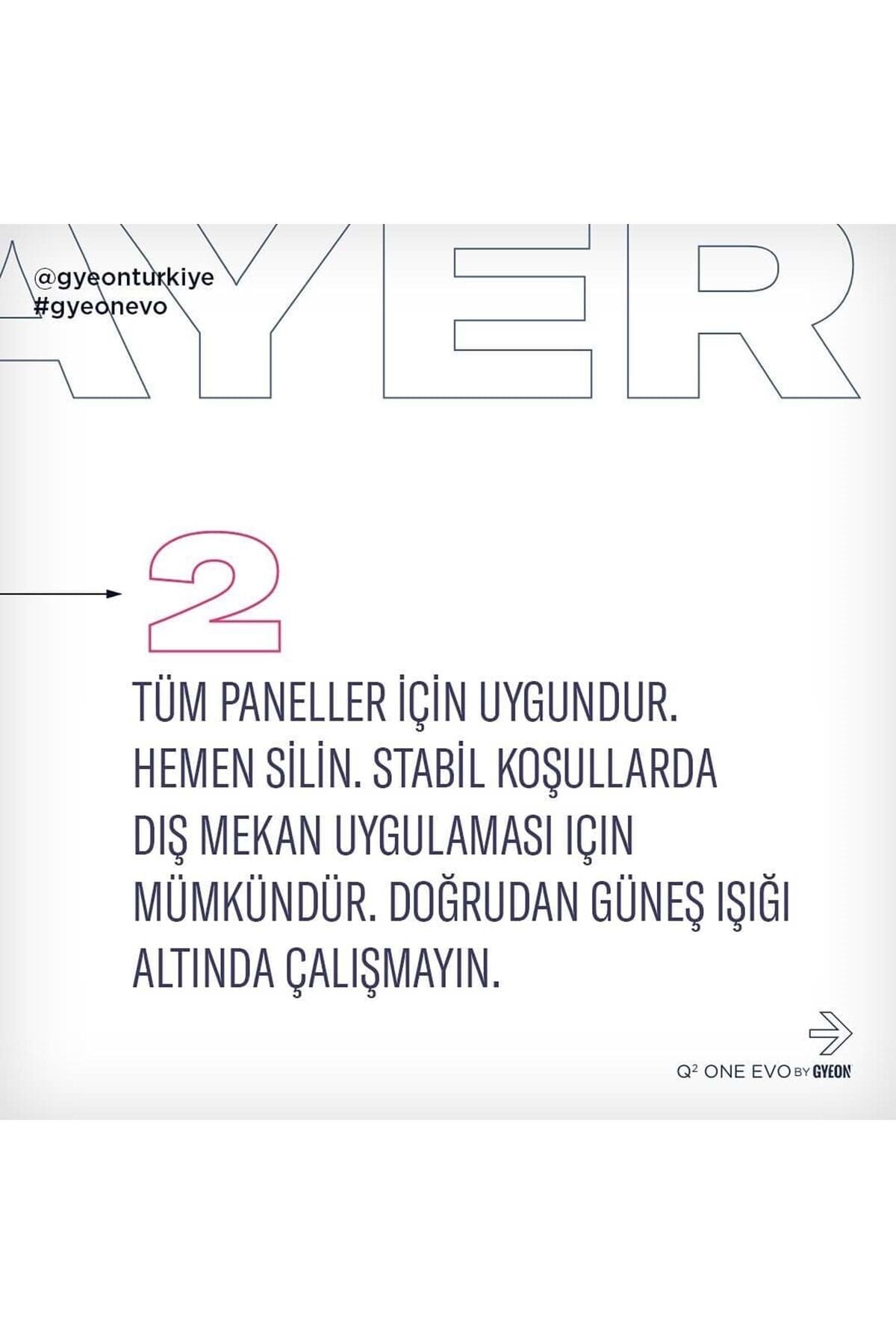 GYEON Q² One EVO, aradığınız tüm koruma özelliklerini içerisinde barındıran, uygulaması kolay, şaşırtıcı şekilde yüksek performanslı ve dayanıklı, başlangıç seviye bir seramik kaplamadır.; Geliştirilmiş EVO versiyonu ile eski versiyona göre %50 daha fazla dayanım, performans ve kimyasala karşı direnç sunarken, aracınıza anında muhteşem su iticilik katar ve şeker parlaklığında bir görünüm verir.; Aynı zamanda, aracınıza zararlı UV ışınlarından korurken, kolay temizlenebilme ve dış etkenlere karşı koruma görevi görür.; GYEON Q² One EVO, flörün ile zenginleştirilmiş SiO2 bazlı EVO versiyonu araç üzerinde 24 ay/25.000 KM ‘ye kadar dayanım gösterirken, PH 2-11 arası kimyasallara dirençlidir.; Geliştirilmiş formülü, tek kat uygulama ile size istediğiniz yüksek performansı verir.; Yenilenen eşsiz formülü ve kutu içerisinde çıkan Q²M Coating Applicator sayesinde yeni 30ml ürün ve eski 50ml ürün aynı metrekare araç yüzeyi kaplayabiliyor.; Bu özellikler de ürünü %40 daha ekonomik ve hızlı uygulanabilir hale getiriyor.; Uygulama sonrasında yüzeye ekstra kayganlık, parlaklık, hidrofobi ve koruma vermek veya yıkama aralıklarında bakımını yapmak için GYEON Q²M Cure, Q²M CeramicDetailer, Q²M QuickDetailer ya da Q²M WetCoat ürünlerini uygulayabilirsiniz.; Kutu İçeriği: Q² One EVO 50 ml / 1x Q²M Coating Applicator Light / 3x Garanti Etiketi / 1x #gyeonized Etiketi / Bakım Kılavuzu / Kullanım Talimatı Dikkat Edilmesi Gereken Noktalar: Panel panel çalışınız.; Hava sıcaklığı ve nem miktarına göre silim sürenizi ayarlayın.; Önce ufak bir parçada uygulama yapın.; Hava sıcaklığı ya da nem yükselirse daha ufak alanlarda çalışıp, daha kısa sürede silme işlemine geçiniz.; ; Direkt güneş ışığı altında ürünü uygulamayın.; ; Ürünü silerken Q²M SoftWipe ya da Q²M PolishWipe ürünlerinizi kullanmanızı tavsiye ederiz.; ; Uygulama sonrası 12 saat ürünü kürleştirin, aracınızı kullanmayın.