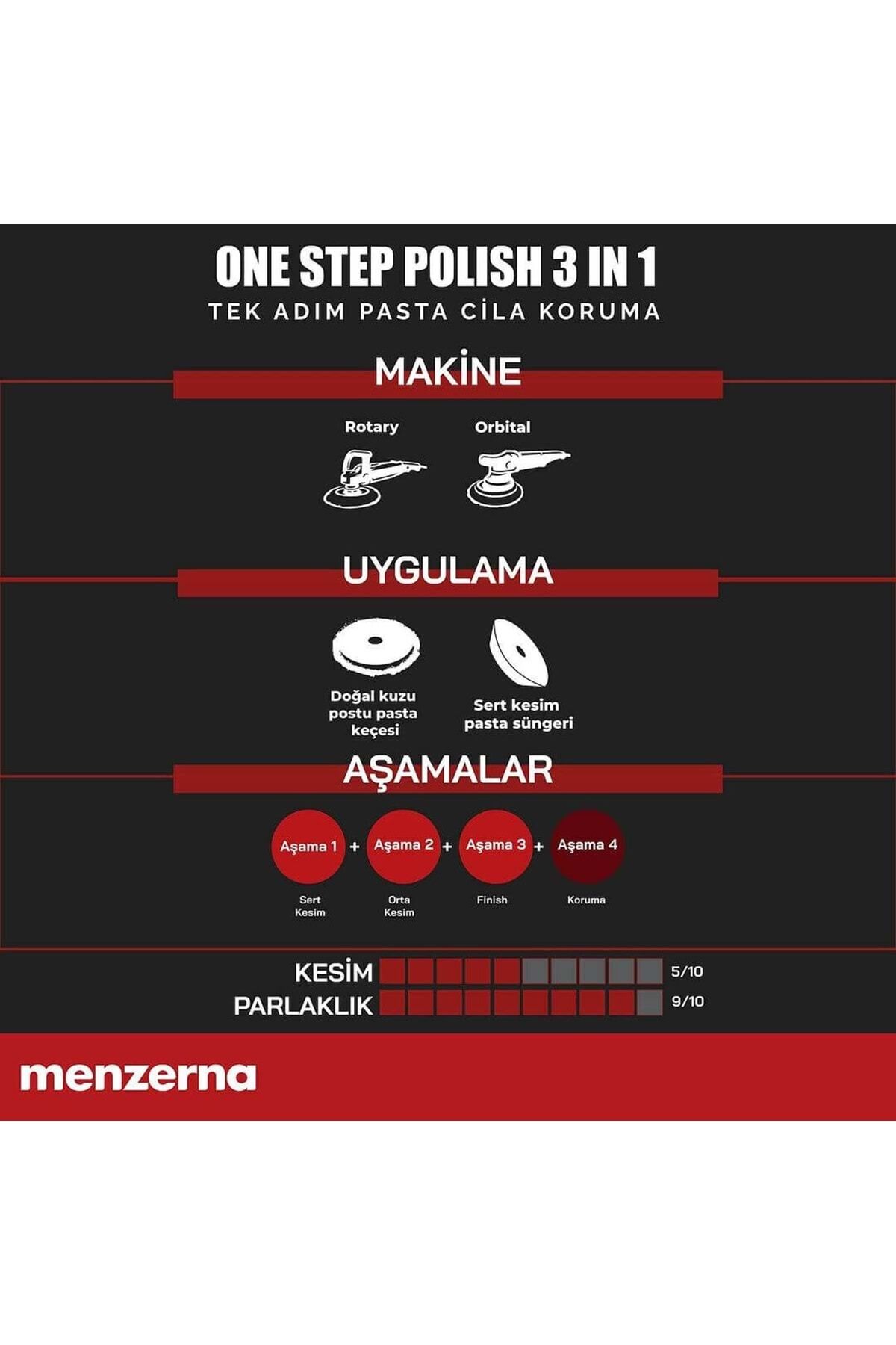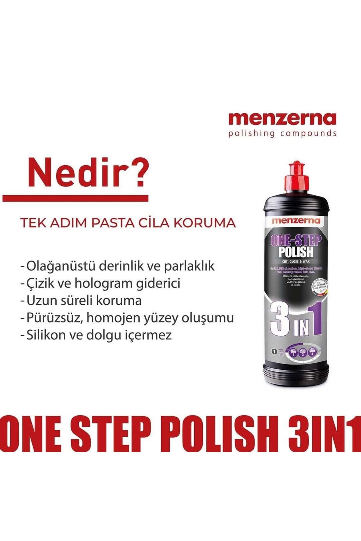 Menzerna One; Step Polish 3 in 1 1 Lt; İnce Çizik ve Hare Giderici, Boya Koruma 3%27ü 1 Arada Yüksek Alman Teknolojisi; Özellikleri : Orjinal Ürün; Çok yönlü bir üründür, 3000 zımpara izlerini, çizikleri, hare izlerini alarak donuk görüntüyü giderir; Yüzeyi parlatarak koruma sağlar; Kolay ve hızlı parlaklık sağlayarak detay koruma işleri için idealdir; Çizik Alma : 10 / 5 Cila / Parlaklık : 10 / 9 1 adımda parlaklık, bitirici cila ve boya koruma; 3000 ve üstü zımpara izlerini alır; Çevresel etmenlere karşı maximum koruma Hızlı derin ve ıslak bir görünümü yüksek parlaklıla sağlar; Yüksek oranda pürüzsüz bir yüzey sağlar; Su itici özellik; Derin ve Islak görünüm; Tekrar boyanabilir; Kolay uygulama; Her çeşit boya rengi ile uyumludur; Aracın değerini korur; Slikon ve doldurucu (Filler) içermez; Örnek Ürün Kullanım Sırası : 1; Adım One; Step Polish 3in1 2; Adım Endless Shine Rotary makine (Medium Cut Foam) Rotary / Oribital (Soft Cut Foam) Orbital makine (Wax Foam PAd) Ekipman Uyumluluk: Menzerna Mediom Cut Foam, oft Cut Foam, Wax Foam Pad ve Mikrofiber bez ile uygulama yapılabilir; Bitirme işlemi için Menzerna Süper Mikrofiber bez kullanın; Orbital makinelerde kullanım hızı, üreticisine bağlıdır; Kimyasal Bilgiler: Yoğunluk : 1 Litre / 1 Kg; Viskolite : 9; 15 Pas Renk : Krem Önemli : Çocuklardan uzak tutunuz; El, vücut, yüz ve gıda temizliğinde kullanmayınız; Serin ve kuru yerde muhafaza ediniz; Fatura İle Gönderilir; Bu İlan ENTEGRA Entegrasyon Sistemleri ile Listelenmiştir;