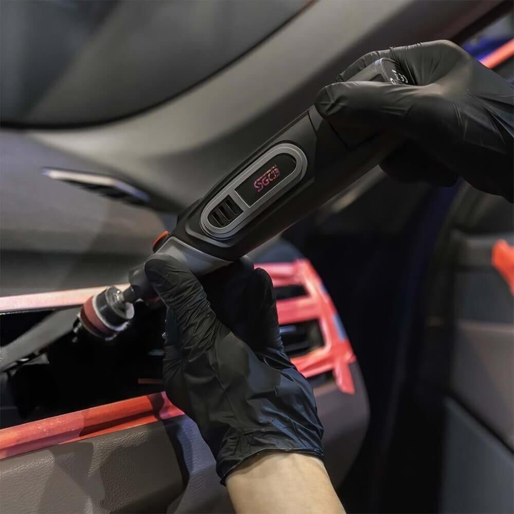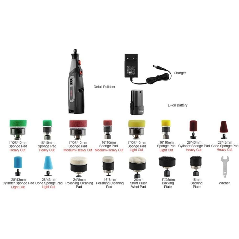 Bu mini nano polisaj makinesi profesyonel detaycıların ve amatörlerin araçların çeşitli bölgelerinde ihtiyaç duyabilecekleri tüm aksesuar setine sahiptir. Mini ve bölgesel onarımlar (farlar, kapı kolları ve işleri, amblemler, çizik cam yüzeyler, iç konsol panelleri ve dar boyalı alanlar) için idealdir. Set içerisinde yatay, konik ve silindirik süngerler, mini keçeler, farklı boyutta tabanlıklar ve pedler bulunur. Ayrıca kolay takma çıkarma işlemleri için demir aparat bulunur.