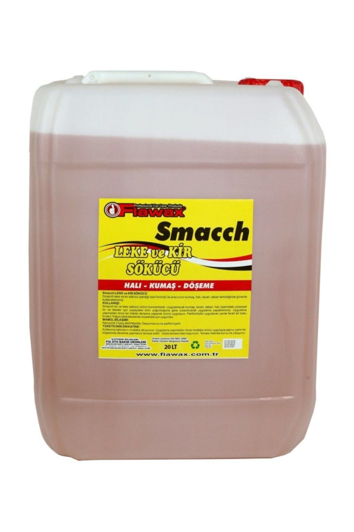 Fiawax smacch leke ve kir sökücü 20lt içerdiği özel formülü ile aracınızın kumaş, halı, tavan, taban temizliğinde güvenle kullanabilirsiniz. ; Kullanılışı: Smacch kir ve leke sökücü ürün konsantredir. ; Uygulanacak kumaş, tavan, taban, halı üzerindeki yüzeysel kir ve lekeler için kirin yoğunluğuna göre sulandırarak uygulama yapabilirsiniz. ; Uygulamadan önce bir miktar deneme yaparak ürünü test edin. ; Parfümlüdür, uygulanan yerde ferah bir koku bırakır. ; Yoğun lokal lekelere müdahale için uygundur.;