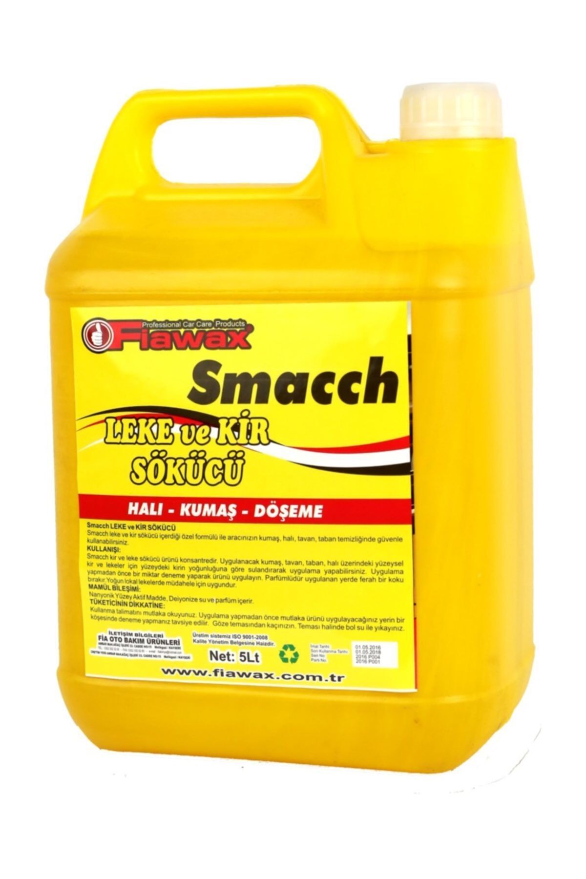 Fiawax smacch leke ve kir sökücü 5kg içerdiği özel formülü ile aracınızın kumaş, halı, tavan, taban temizliğinde güvenle kullanabilirsiniz. ; Kullanılışı: Smacch kir ve leke sökücü ürün konsantredir. ; Uygulanacak kumaş, tavan, taban, halı üzerindeki yüzeysel kir ve lekeler için kirin yoğunluğuna göre sulandırarak uygulama yapabilirsiniz. ; Uygulamadan önce bir miktar deneme yaparak ürünü test edin. ; Parfümlüdür, uygulanan yerde ferah bir koku bırakır. ; Yoğun lokal lekelere müdahale için uygundur.;