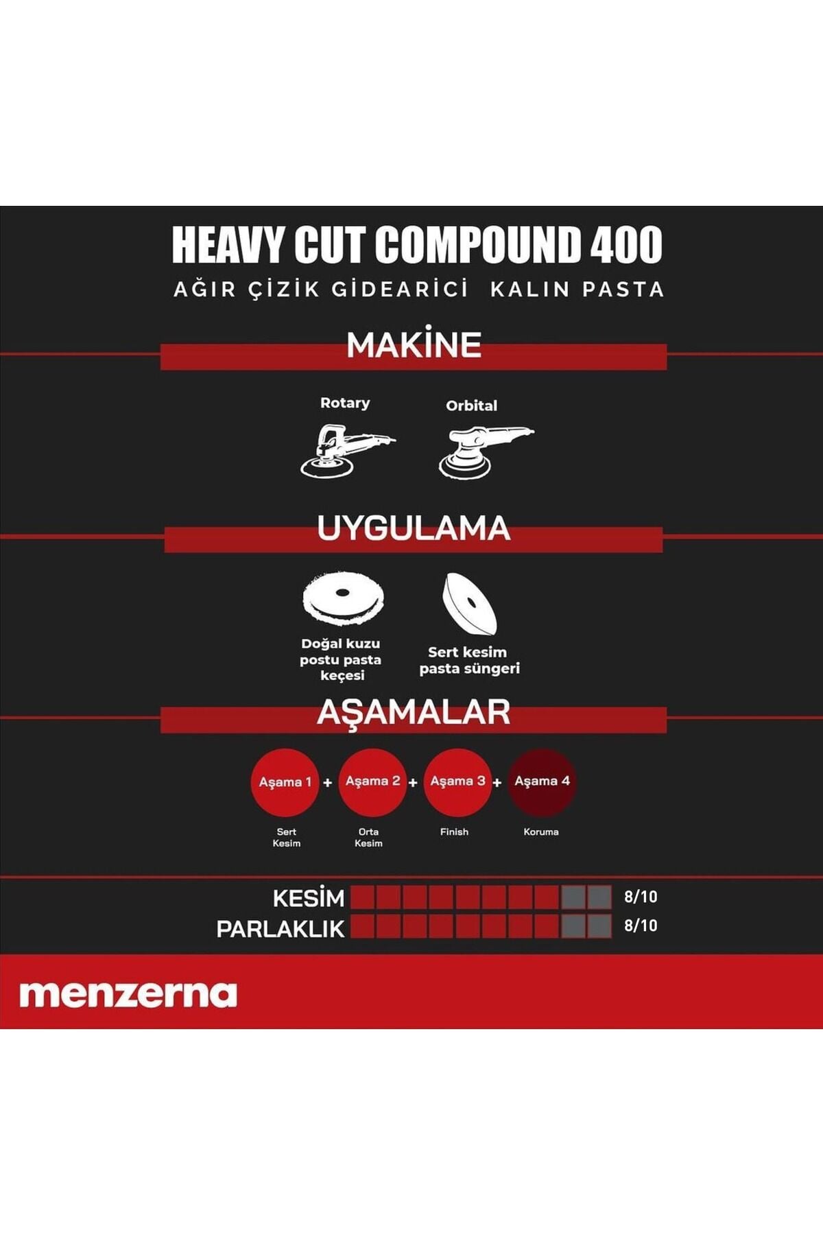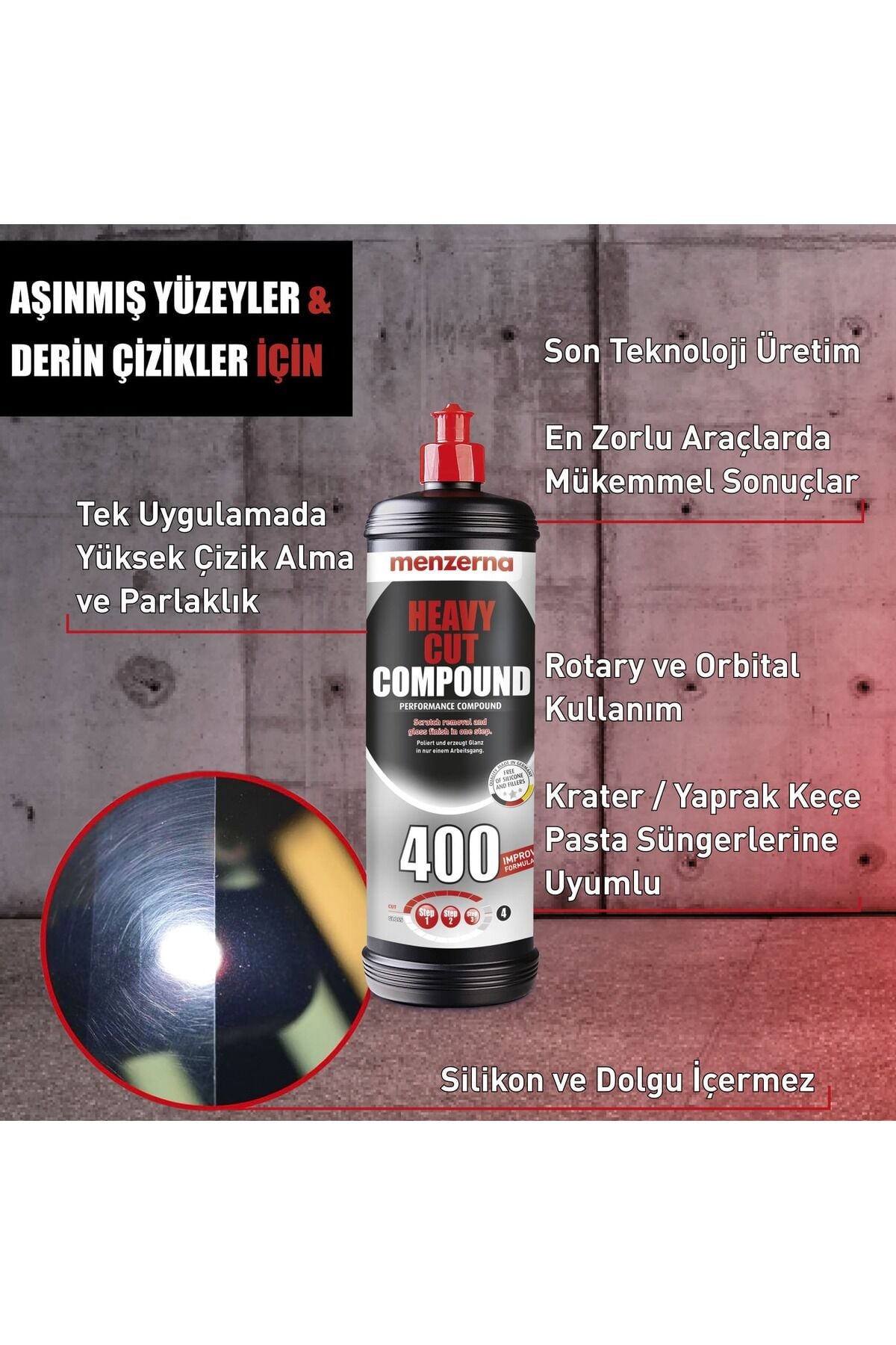 Menzerna Heavy Cut Compound YENİ 400 Ağır Çizik Giderici Kalın Pasta 1 LT Ürün Açıklama: Sektörün lider ağır çizik gidericisi, mükemmeli hedefleyen detay profesyonelleri ve hobi kullanıcıları için yenilendi! Otomotiv yüzeyleri için üretilen en yenilikçi çizik giderici formül, tüm yüzeyde göz kamaştıran, kalıcı bir sonuç bırakır.; Rekor sürede, çizik ve 1500p ve üstü zımpara izlerini giderir.; Son teknoloji çizik alma ve parlatma bileşenleri sayesinde, mükemmel yüzeye ulaştırır.; YENİ MENZERNA HCC 400 Ağır Çizik Giderici Kalın Pasta; ? DAHA GÜÇLÜ Artırılmış çizik giderme performansı ile en zorlu araçlarda bile kalıcı çözüm sunar.; ? DAHA HIZLI Hızlandırılmış yeni molekül yapısı ile uygulama sürenizi kısaltır.; ? DAHA VERİMLİ Yayılımı artırılmış içeriği sayesinde çok daha az miktarda ürün ile yüzeyde daha uzun süre, minimum hare bırakarak çalışmanıza fırsat verir.; Araç yüzeyinde yüksek parlaklık bırakır.; ? KOKUSUZ Kapalı alanlarda uygulama esnasında ortaya çıkabilen eser miktarda koku, tamamen giderildi.; Çalışma kolaylığı artırıldı.; ? GÜVENLİ Toz oluşumu azaltılan YENİ 400, insan ve çevre sağlığına zarar vermeyecek formülasyonda geliştirildi.; ? KALICI Tüm Menzerna pasta ürünlerinde olduğu gibi YENİ 400 ürünü de “silikon, dolgu, örtücü ve kapatıcı madde” içermemektedir.; Her araç markası, boya rengi ve vernik tipi ile uyumludur.; Seramik kaplama ve boya koruma ürünleri öncesinde güvenle kullanılabilir.; Çizik Giderme Özelliği : 8/10 Parlatma Özelliği : 8/10 Ekipman Uyumluluk: Tüm Rotary ve Orbital makineler ile kullanılabilir.; Krater, doğal kuzu postu tip keçeler ve pasta süngerleri ile uygulama yapılabilir.; Rotary Makineler de 800 - 1200 rpm arası hız önerilir.; Orbital makinelerde kullanım hızı, üreticisine bağlıdır.; Kimyasal Bilgiler: Yoğunluk : 1 Litre / 1.1 kg Viskolite : 9-15 Pas Renk : Beyaz Önemli : Kullanmadan önce mutlaka iyice çalkalayınız.; Çocuklardan uzak tutunuz.; El, vücut, yüz ve gıda temizliğinde kullanmayınız.; Serin ve kuru yerde, direkt güneş ışığından uzakta muhafaza ediniz.